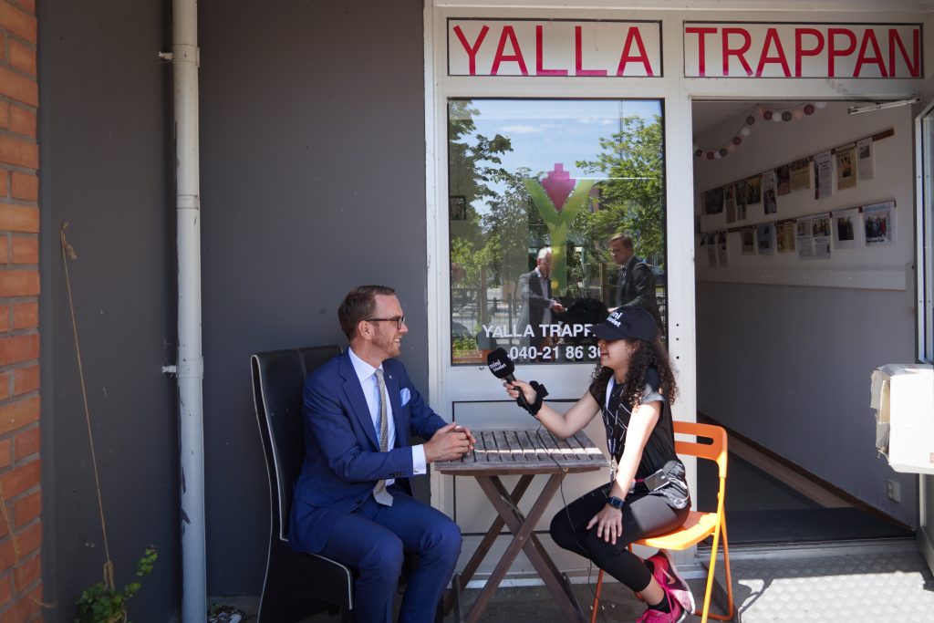 Sveriges infrastruktur- och bostadsminister Andreas Carlson besökte Rosengård. Här intervjuas han av Jasmin utanför Yalla trappan. Foto: Gustav Sigala Haggren.