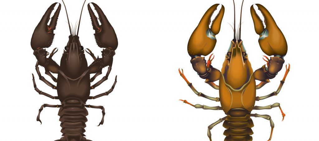 Flodkräftan och signalkräftan. Illustration: Jakob Robertsson, Havs- och vattenmyndigheten.